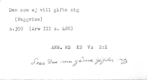//// Den som ej vill gifta sig //// (Vaggvisa) //// s.399 (Arw III s. 486) //// ARW. MS KB Vs 2:2 ////