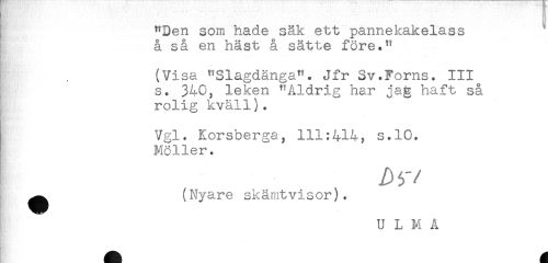 //// ! //// "Den som hade säk ett pannekakelass //// å så en häst å sätte före." //// (Visa "Slagdänga". Jfr Sv.Forns. III //// s. 340) leken "Aldrig har jag haft så //// rolig kväll). //// Rå //// Vgl. Korsberga, 111:414? s.10. //// Möller. //// Dr //// /^^ (Nyare skämtvisor). //// U L M A ////