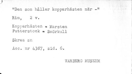 //// "Den som håller kopparhästen när //// Rim, 2 v. //// Kopparhästen = Karsten ' //// Putterstock . Smörkull //// Skrea sn //// Acc. nr 43^7, sid. 6. //// t //// VARBERG MUSEUM ////