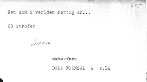 //// Den som i verlden fattig är... //// 23 strofer //// i //// i //// DÅLA FORNS AL 4 s.12 //// E ////
