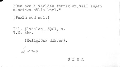 //// ! //// "Den som i världen fattig är,vill ingen //// människa hålla kärl." //// ! //// (Psalm med mel.) //// i //// i //// Dal. Älvdalen, 8901, s. //// T.G. Åhs. //// ' j //// i //// (Religiösa dikter). //// t //// U L M A ////
