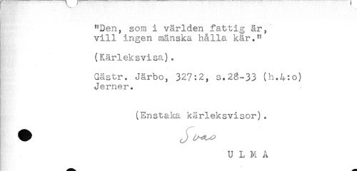 //// "Den, som i världen fattig är, //// vill ingen mänska hålla kär." //// (Kärleksvisa). //// Gästr. Järbo, 327:2, s.28-33 (h,4:o) //// Jerner. //// (Enstaka kärleksvisor). //// # J //// U L M A ////
