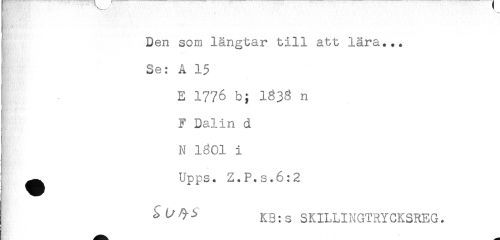 //// Den som längtar till att lära... //// Se: A 15 //// E 1776 b; 1338 n //// F Dalin d //// N 1801 i //// ^ Upps. Z.P.s.6:2 //// i KB:s SKILLINGTRYCKSREG. ////