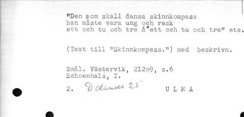 //// n //// "Den som skall dansa skinnkompass //// han måste vara ung och rask //// ett och tu och tre å/ett och tu och tre" etc. //// (Text till "Skinnkompass.") med beskrivn. //// } - - ^ //// Smål. Västervik, 212o9, s*6 //// Schoenhals, 1. //// ^ 2. T) ^^^ ^^ U L M Å ////