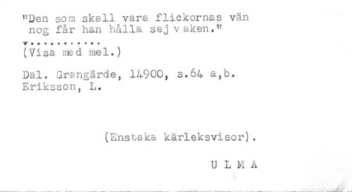 //// "Den som skall vara flickornas vän //// nog får han hålla sej v åken,^ //// V***. ** '**' //// (Visa med mel.) //// Dal. Grengärde, 14900^ s.64 a,b. //// Eriksson, L. //// (Enstaka kärleksvisor). //// U L M A ////