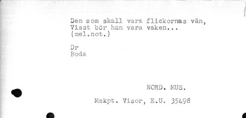 //// I Den som skall vara flickornas vän, //// Visst bör han vara vaken... //// (mel.not.) //// Dr //// Boda //// ^ NORD. MUS. //// Mskpt. Visor, E.U. 35498 ////