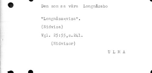 //// * Den som sa vära Longnåsabo //// "Longnåsa^visa". //// (Nidvisa) //// Vgl. 25:55,s.241. //// - //// (Nidvisor) //// U L M A //// § ////