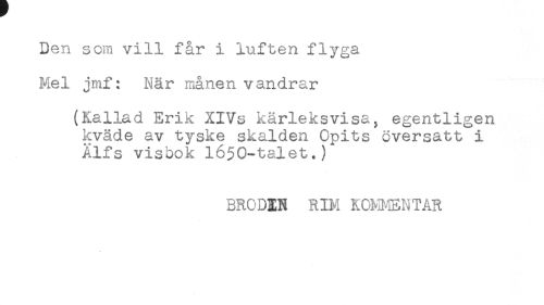 //// Den som vill får i luften flyga //// Mel jmf: När månen vandrar //// (Kallad Erik XIVs kärleksvisa, egentligen //// kväde av tyske skalden Opits översatt i //// Alfs visbok 1650-talet.) //// BRODIN RIM KOMMENTAR ////