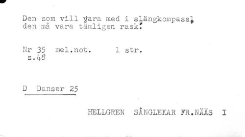 //// Den som vill yara med i slängkompass^ //// den må vara tämligen raskt //// Nr 35 mel.not. 1 str. //// s. //// D Danser 25 //// KELLGREN SÅNGLEKAR FR.NAÄS I ////