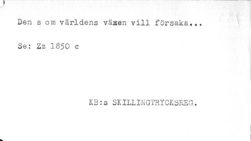 //// Den s om världens vägen vill försaka... //// Se: Zz 1850 c //// t //// i //// KB:s SKILLINGTRYCKSREG. //// c //// * //// i ////