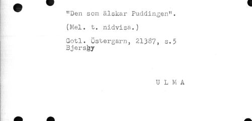 //// "Den som älskar Puddingen". //// (Mel. t. nidvisa.) //// Gotl. östergarn, 213^7, s.5 //// Bjers^y //// U L M A //// t ** ////