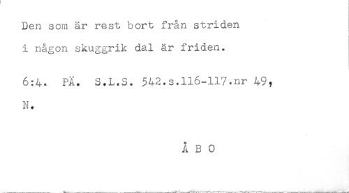 //// Den som är rest bort från striden //// i någon skuggrik dal är friden. //// 6:4. PA. S.L.S. 542.s.116-117.nr 49, //// N. //// ÅBO ////