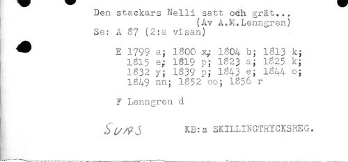 //// Den stackars Nelli satt odh grät... //// (Av A.M.Lenngren) //// Ser A 37 (2:a visan) //// ^ E 1799 a^ 1800 x,; 1804 b; 1813 k; //// 1815 e; 1819 p; 1823 a; 1825 k; //// 1832 y; 1839 p; 1343 e; 1844 o; //// 1849 nn; 1852 00; 1856 r //// F Lenngren d //// KM //// .j^.'^ ) KB: s SKILLINGTRYCKSREG. ////