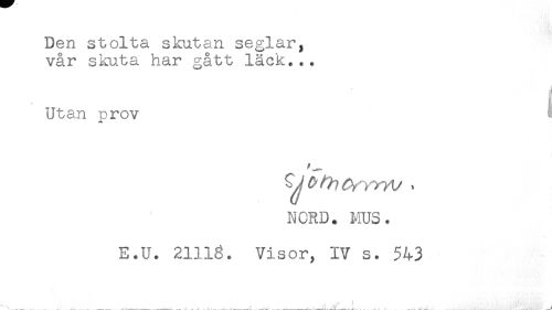 //// Den stolta skutan seglar, //// vår skuta har gått läck... //// Utan prov //// NORD. MUS. //// E.U. 21116. Visor, IV s. 543 ////