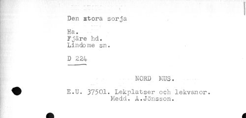 //// Den gtora sörja //// Ha. //// Fjäre hd. //// Lindö me sn. //// D 224 //// i ' NORD MUS. //// ^^ E.U. 37501. Lekplatser och lekvanor. //// Medd. A.Jönsson. ////
