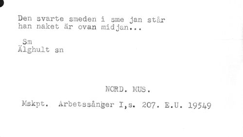 //// Den svarte smeden i sme jan står //// han naket är ovan midjan... //// Sm //// Älghult sn //// NORD. MUS. //// Mskpt. Arbetssånger I,s. 207. E.U. 19549 ////