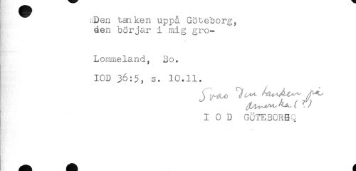 //// .Den tanken uppå Göteborg, //// den börjar i mig gro- //// HBy*^-?--—-- //// Lommeland, Bo. //// IOD 36:5, s. 10,11. //// IOD GÖTEBORBQ //// ^ * ////