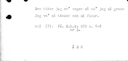 //// Den tiden jag va* unger så va* jag så grann //// ^^^ Jag va* så täcker och så finer. //// ^ 4:5 (7). PA. S.L.S. 279 S, 6-g //// nr 3* //// ÅBO ////