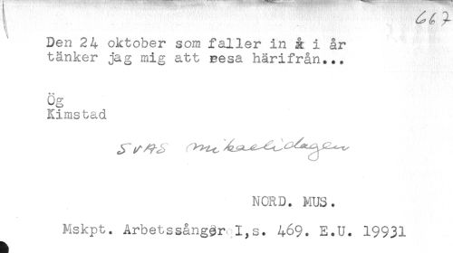 //// Den 2 4 oktober som faller in å i år //// tänker jag mig att nesa härifrån... //// a * //// Og //// Kimstad //// NORD. MUS. //// Mskpt. Arbetssång^r I,s. 469. E.U. 19931 ////