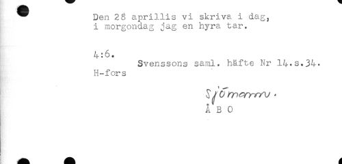 //// ^ Den 2 8 aprillis vi skriva i dag, //// i morgondag jag en hyra tar. //// 4:6. //// Svenssons saml. häfte Nr 14.S.34* //// H-fors //// ÅBO ////