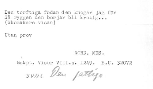 //// Den torftiga födan den knogar jag för //// Så ryggen den börjar bli krokig... //// (Skomakare visan) //// i //// Utan prov //// NORD. MUS. //// Mskpt. Visor VIII.s. 1249. E.U. 32072 ////