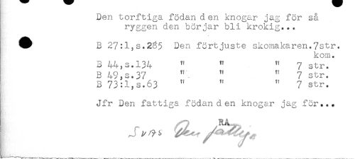 //// Den torftiga födan den knogar jag för så //// ! ryggen den börjar bli krokig... //// ^^ B 27:1,s.Den förtjuste skomakaren.7str. //// kom. //// ! 3 44,s.134 ^ " " 7 str. //// ! B 49;3*37 ^^ ^ ^ 7 str. //// 3 73:l,s.63 ^ " ^ 7 str. //// Jfr Den fattiga födanden knogar jag för... //// RÅ* ////