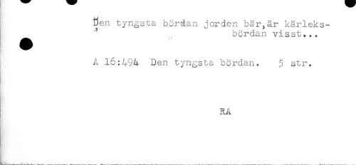 //// R' //// tjen tyngsta bördan jorden bär,år kärleks- //// I ^ bördan visst... //// i //// A 16:494 Den tyngsta bördan. 5 str. //// RA ////