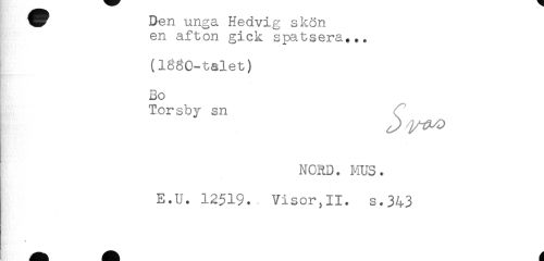 //// V Den unga Hedvig skön //// en afton gick spatsera... //// (1880-talet) //// Bo //// Torsby sn <(" //// NORD. MUS. //// E.U. 12319. Visor,II. s.343 //// t ////