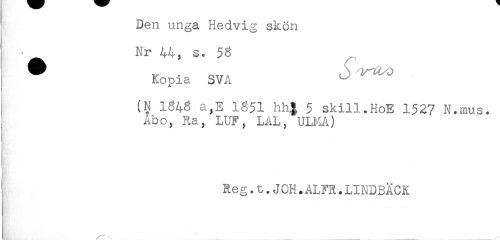 //// Den unga Hedvig skön //// - Nr 44, s, % //// Kopia SVA ^ //// ! //// (N 1848 a,E 1851 hhj 5 skill.HoE 1527 N.mus. //// Abo, Ra, LUF, LAL, ULMA) //// ii'. //// , //// Reg.t.JOH.ALFR.LINDBÅCK //// ____ * //// _____ ____ ____ _____ ////