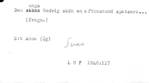 //// unga //// Den gksHR Hedvig skön en aftonstund spatsera.., //// (fragm*) //// S:t Anna (ög) //// J Z^^ //// \ * //// A //// L u y 1946:117 ////