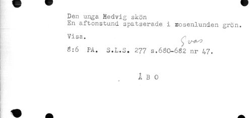 //// Den unga Hedvig skön //// En aftonstund spatserade i Rosenlunden grön. //// Visa. /i //// ) //// 3:6 PÅ. S.L.S. 277 s.680-682 nr 47. //// } //// ÅBO //// f ////