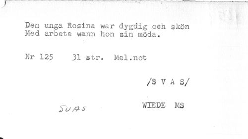 //// Den unga Rosina war dygdig och skön //// Med arbete wann hon sin möda. //// Nr 125 31 str. Mel.not //// /S VAS //// /WIEDE MS ////