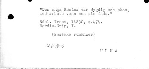 //// "Den unga Rosina var dygdig och skön, //// ^^ med arbete vann hon sin föda," //// ; Sdml. Trosa, 14^30, s.474* //// Nordin-Grip, //// ! (Enstaka romanser) //// t //// U L M Å //// s ////