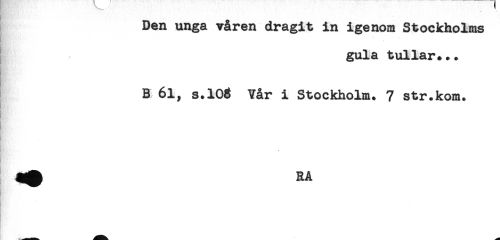 //// Den unga våren dragit in igenom Stockholms //// gula tullar... //// g //// B 61, s.lOé Yår i Stockholm. 7 str.kom. ////