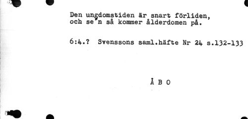 //// Den ungdomstiden år snart förliden, //// och se n så kommer ålderdomen på. //// 6:4.? Svenssons saml.häfte Nr 24 s.132-133 //// t //// ÅBO //// - . ////