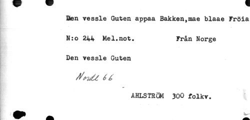//// Ben vessle Guten appaa Bakken^mae blaae Fröia //// - //// N:o 244 Mel.not. Från Norge //// .. //// Den vessle Guten //// v //// AHLSTRÖM 300 folkv. //// * ////
