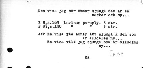 //// t //// Den visa jag här ämnar sjunga den är så //// vacker och ny... //// ! //// B 3,s.l69 Lovisas paraply. 5 str. //// B 33,s.120 " " 5 str. //// Jfr En visa %ag ämnar att sjunga å den som //// är alldeles ny... //// En visa vill jag sjunga som är alldeles //// ny... //// i ^^ //// RA ////