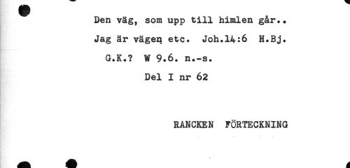 //// Den väg, som upp till himlen går.. //// Jag är vågeq etc. Joh.l4:6 H.Bj. //// G.K.? W 9.6. n.-s. //// Del I nr 62 //// RANCKEN FÖRTECKNING //// * t . * .n ////