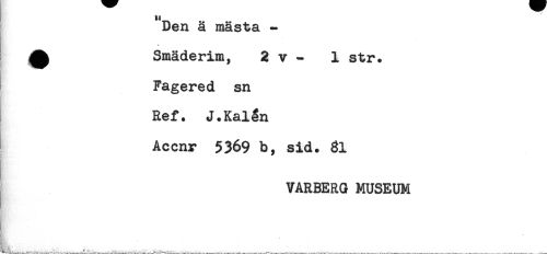 //// "Den ä mästa - //// ^ Smäderim, 2 v - 1 str. //// Fagered sn //// E //// Ref. J.Kalén //// H; * //// Accnr 5369 b, sid. 61 //// VARBERG MUSEUM //// L_____,___._____ ////