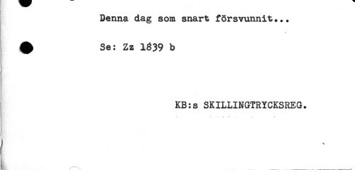 //// j //// Denna dag som snart försvunnit... //// ^ Se: Zz 1839 b //// ! //// - //// i //// - //// q //// KB:s SKILLINGTRYCKSREG. //// * ** <. -.*< .. **- //// j ////