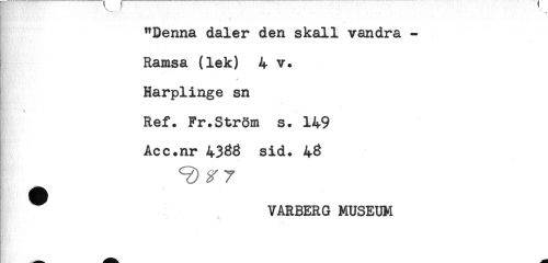 //// "Denna daler den skall vandra - //// Ramsa (lek) 4 v. //// Harplinge sn //// Ref. Fr.Ström s. 149 //// Acc.nr 4333 sid. 43 //// VARBERG MUSEUM //// ' //// -' - //// - ////