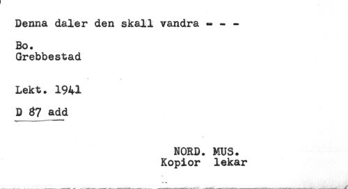 //// Denna daler den skall vandra - - - //// Bo. //// Grebbestad //// Lekt. 1941 //// D 87 add //// NORD. MUS. //// Kopior lekar ////
