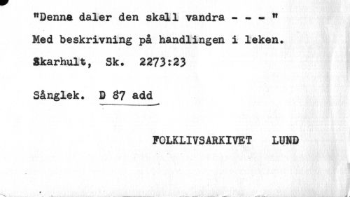 //// "Denna daler den skall vandra - - - " //// Med beskrivning på handlingen i leken. //// &karhult, Sk. 2273:23 //// Sånglek. D 87 add //// FOLKLIVSARKIVET LUND //// -t - t //// _____ .< ....... ' ___ . , j/ ^ ////