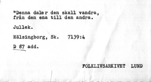 //// "Denna daler den skall vandra, //// från den ena till den andra. //// Jullek. //// Hälsingborg, Sk. 7139:4 //// D add. //// FOLKLIVSARKIVET LUND //// - j " : ////
