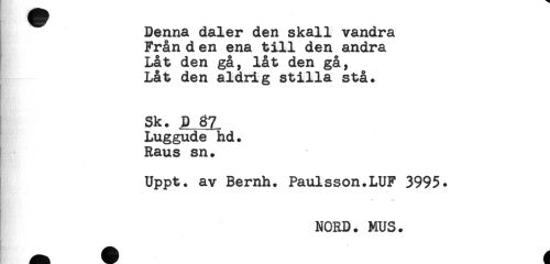 //// Denna daler den skall vandra //// Från d en ena till den andra //// Låt den gå, låt den gå, //// Låt den aldrig stilla stå. //// Sk. P 37 //// Luggude hd. //// Raus sn. //// Uppt. av Bernh. Paulsson.LUF 3995. //// - //// NORD. MUS. ////