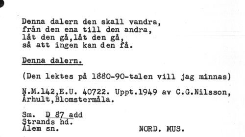 //// Denna dal em den skall vandra, //// från den ena till den andra, //// låt den gå,låt den gå, //// så att ingen kan den få. //// Denna dalern. //// (Den lektes på 1330-90-talen vill jag minnas) //// N.M.142,E.U. 40722. Uppt.1949 av C.G.Nilsson, //// Arhult,Blomstermåla. //// Sm. D_g7_add //// Strands hd. //// Alem sn. NORD. MUS. ////