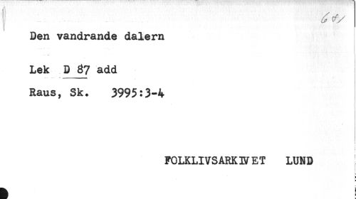 //// Den vandrande dalern //// Lek D 87 add //// Raus, Sk. 3995:3-4 //// i //// ! //// FOLKLIVS ARK TY ET LUND //// ! //// ! //// - ////