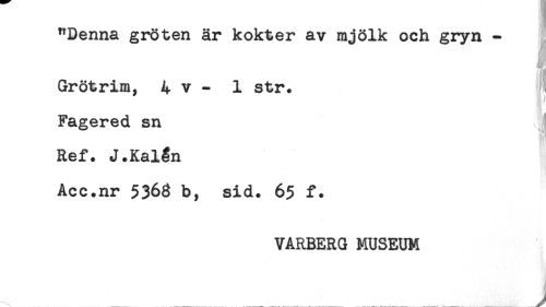 //// "Denna gröten är kokt er av mjölk och gryn - //// Grötrim, 4 v - 1 str. //// i //// Fagered sn ^ //// Ref. J.Kalén //// Acc.nr 5363 b, sid. 65 f. //// VARBERG MUSEUM //// ,.....^...... ._____....___.....J ////