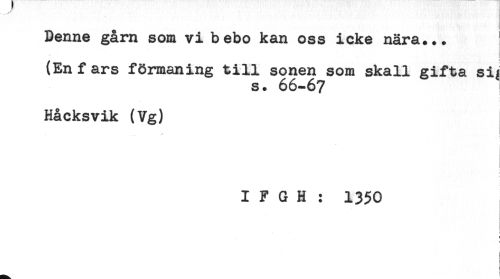 //// Denne gårn som vi bebo kan oss icke nära... //// . //// (En fars förmaning till sonen som skall gifta si; //// s. 66-67 //// Håcksvik (Vg) //// ! //// I F G H : 1350 //// ! //// ! //// - ////