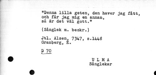 //// ...... . . . , . . , //// — - . * //// "Denna lilla geten, den haver jag fått, //// och får jag mig en annan, //// så är det väl gott." //// - //// (Sånglek m. beskr.) //// Jtl. Alsen, 7347, s.1448 //// Granberg, E. //// D 70 //// # U L M A //// Sånglekar ////
